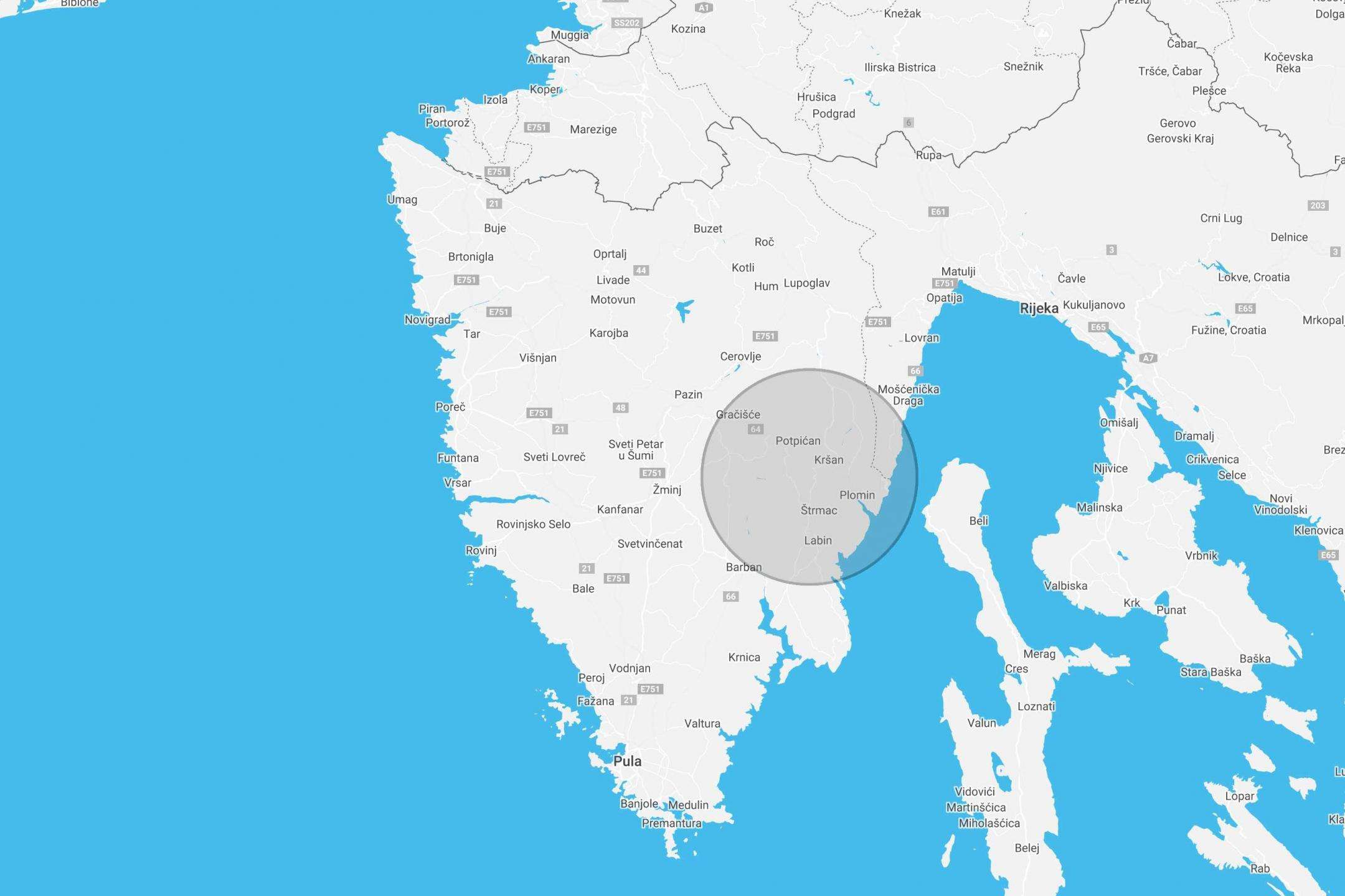 Der städtische Teil von Labin ist 2 km Luftlinie vom Meer und 3 km vom Ferienort Rabac an der Ostküste Istriens entfernt. Die Altstadt liegt auf einem Hügel, und der andere Teil der Stadt darunter ist als Podlabin bekannt (ursprünglich als Bergbausiedlung in den 1930er Jahren entstanden). Durch Labin führt die Staatsstraße, die Rijeka und Pula verbindet. Der nächste Flughafen ist der 40 km von der Unterkunft entfernte Flughafen Pula. Die nächste Eisenbahn ist Lupoglav-Pazin-Pula. Der nächste Fährhafen ist Brestova mit Verbindungen zur Insel Cres und der Wirtschaftshafen Bršica bei Trget. Die Liste der Siedlungen in der Gemeinde Labin: