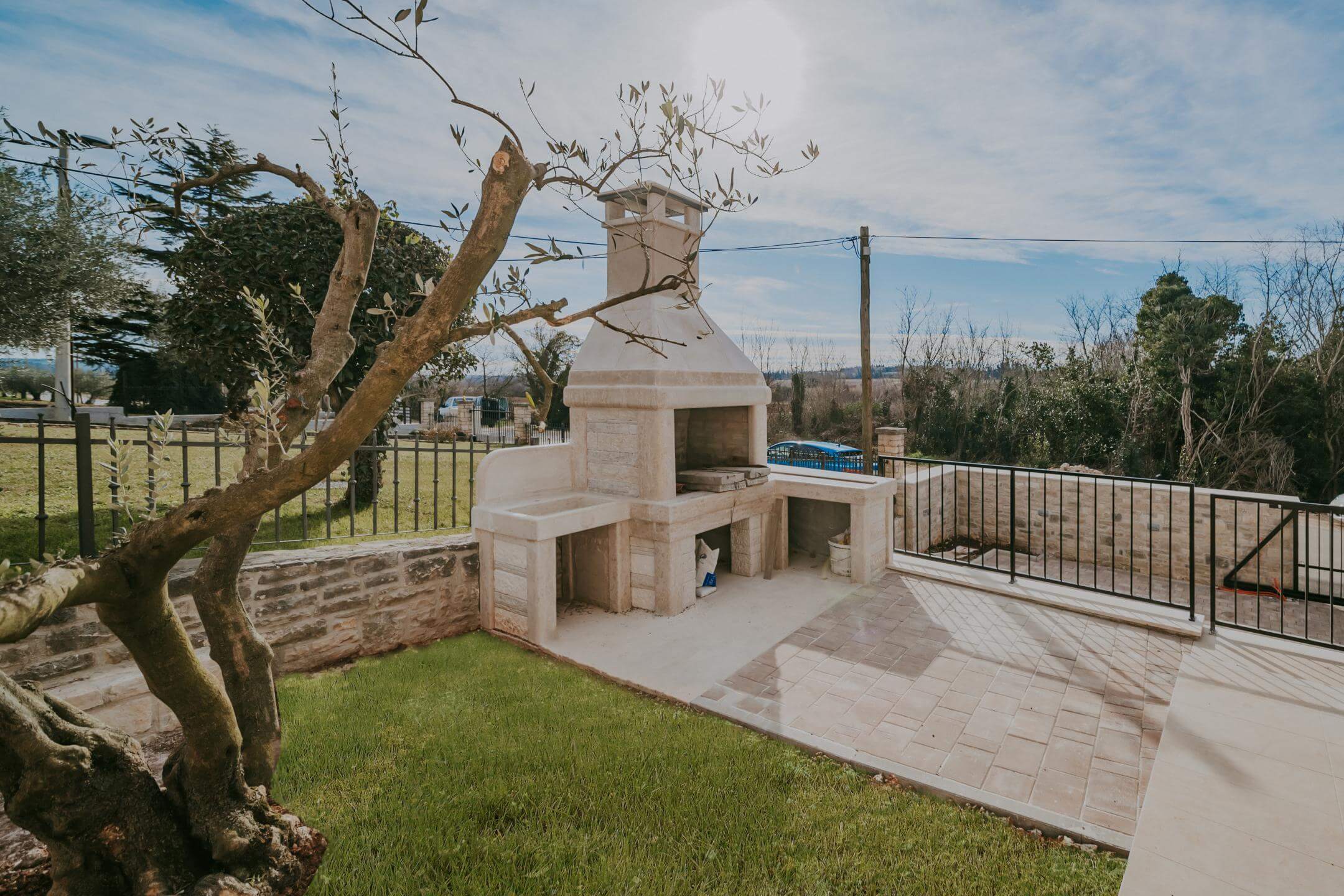 Uz kuću se nalazi bazen veličine 25 m² sa sunčalištem i kamenim kaminom. Vila se prodaje po sistemu ključ u ruke, bez namještaja. Novi resort s infinity bazenom i wellness centrom udaljen je samo nekoliko minuta hoda. Za sve ljubitelje sporta na samo 800 m udaljenosti nalazi se golf teren s 18 rupa, šetnica, biciklistička staza, kao i razni kvalitetni restorani, vinarije, trgovine i razni drugi turistički sadržaji. Slovenska granica udaljena je samo nekoliko minuta vožnje, a centar Umaga udaljen je 7 minuta vožnje. Ova kuća je izvrsna investicijska prilika za bavljenje turizmom ili cjelogodišnjim stanovanjem, s obzirom da se nalazi na izvrsnoj lokaciji sa svim potrebnim sadržajima.
