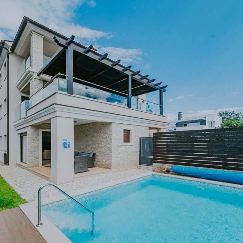 U Fažani se prodaje samostojeća apartmanska kuća sa 4 stambene jedinice i bazenom udaljena samo 500 metara od centra grada i mora. Kuća je izgrađena kao stambena zgrada za turistički ili dugoročni najam, a može poslužiti i kao kuća za odmor za veće obitelji. Prostire se na tri etaže i sastoji se od tri prostrana apartmana i jednog studio apartmana u prizemlju. Ukupna stambena površina kuće je 393 m². Kuća ima ukupno 6 spavaćih soba, 6 kupaonica i 2 dodatna wc-a te može primiti ukupno do 12 gostiju.
