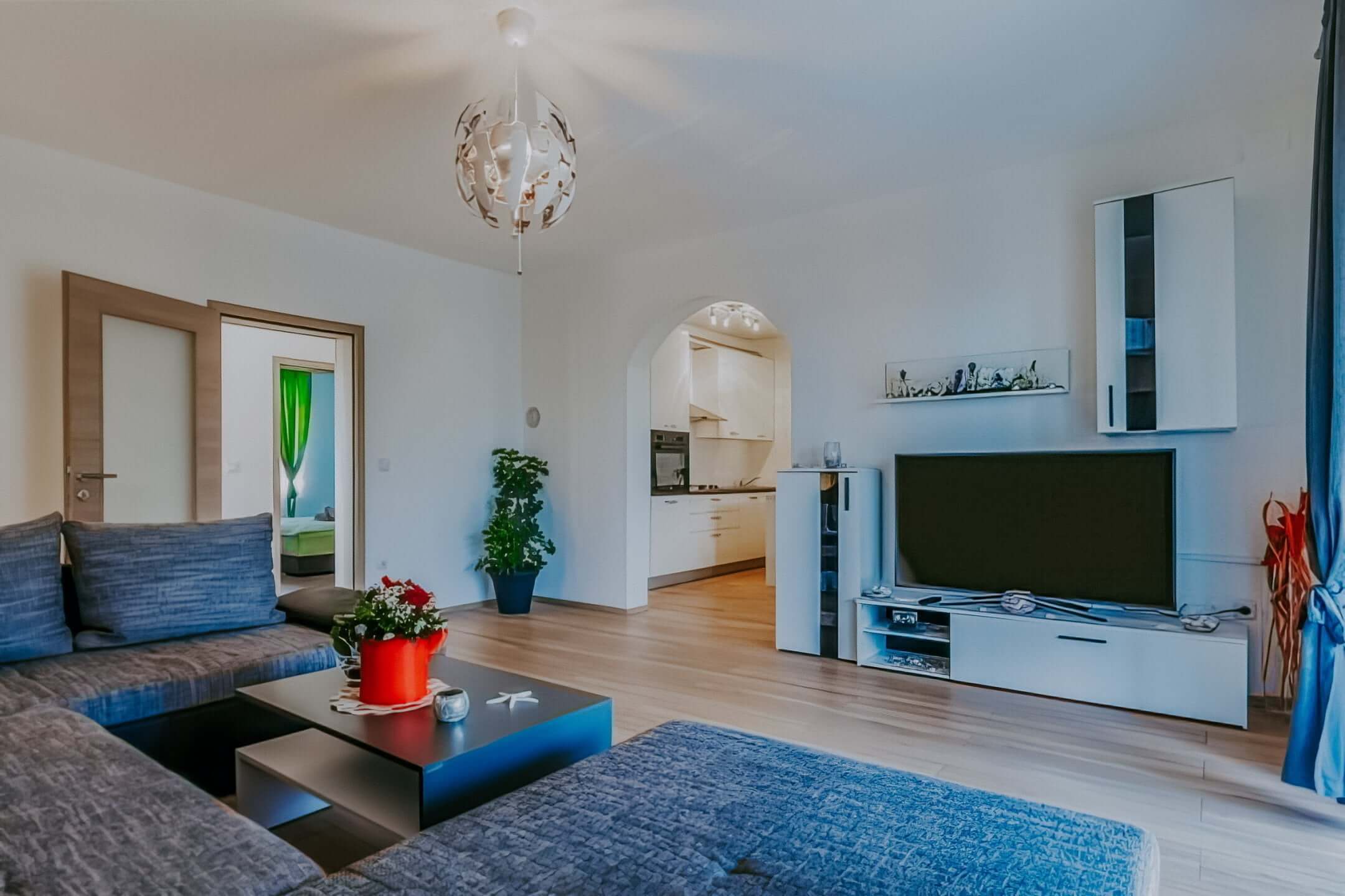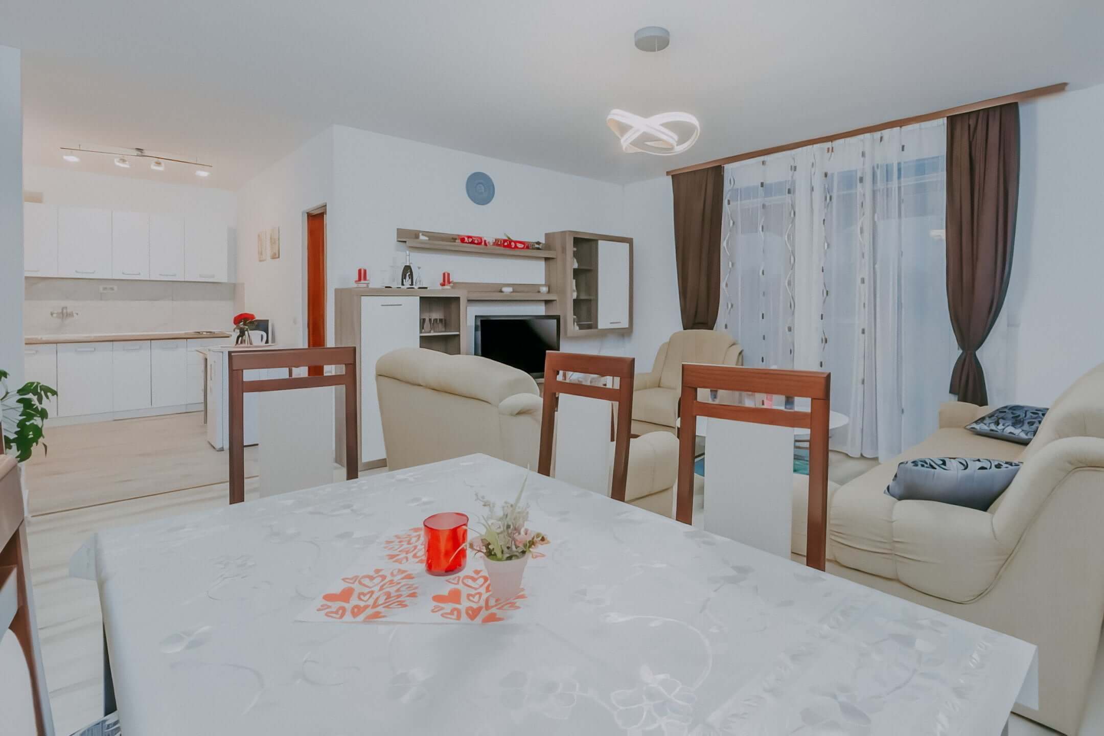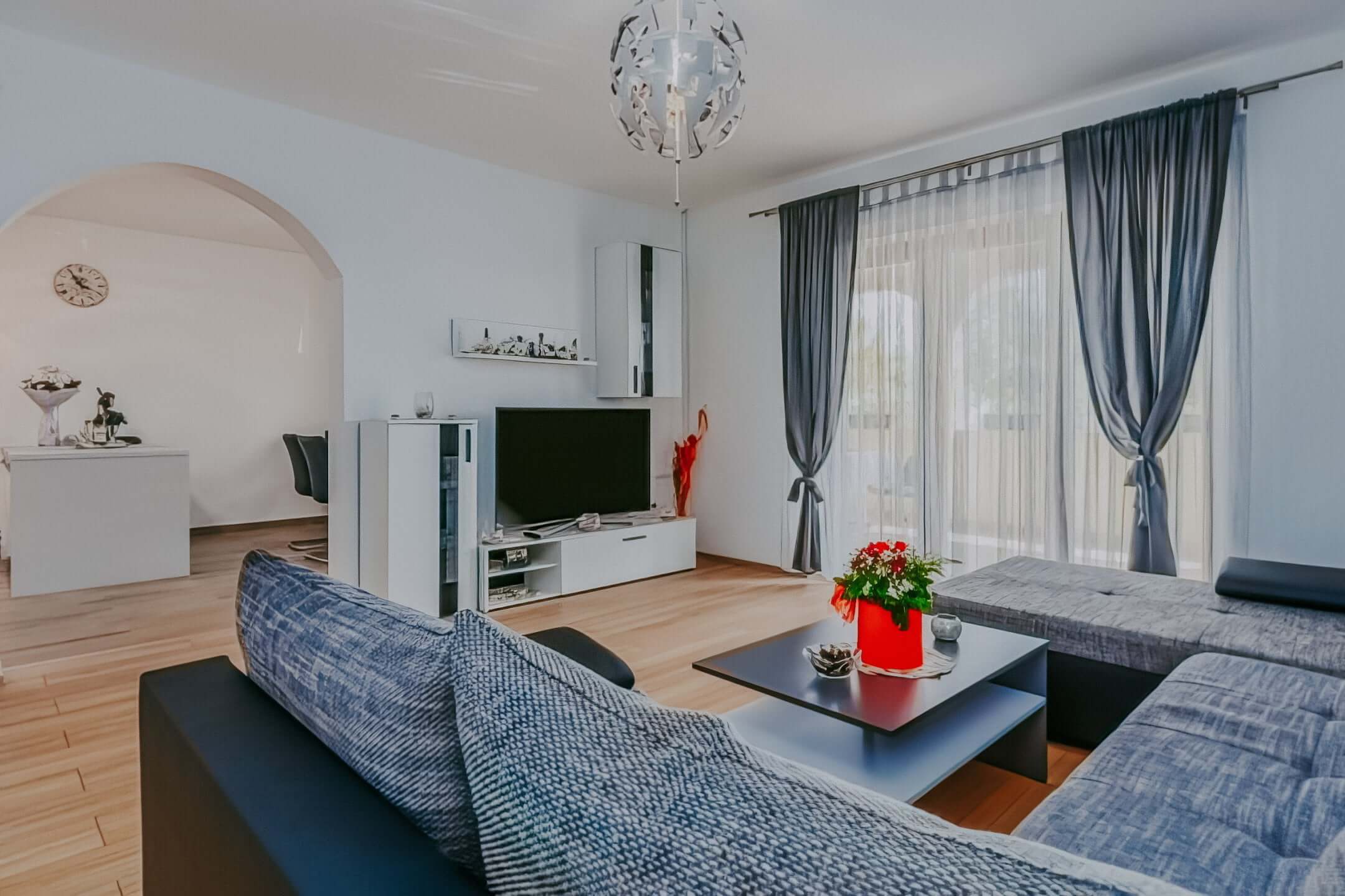 Prodaje se ova prostrana apartmanska kuća sa pet apartmana i pogledom na more u predgrađu Poreča. Kuća ima tri etaže i ukupne površine 390 m². Kuća se uspješno iznajmljuje u ljetnoj sezoni tako da se može nastaviti sa uslugom iznajmljivanja. U prizemlju se nalazi jedan apartman koji se sastoji od prostranog dnevnog boravka, kuhinje, blagovaonice sa izlazom na natkrivenu terasu, dvije spavaće sobe i kupaonice. Na prvom i drugom katu nalaze se dva apartmana koji su također potpuno opremljeni sa kuhinjom, blagovaonicom, dnevnim boravkom, kupaonicom, a svaki apartman ima svoju terasu. Kuća je orijentirana prema jugozapadu, tako da u večernjim satima možete uživati u zalasku sunca i pogledu na more.