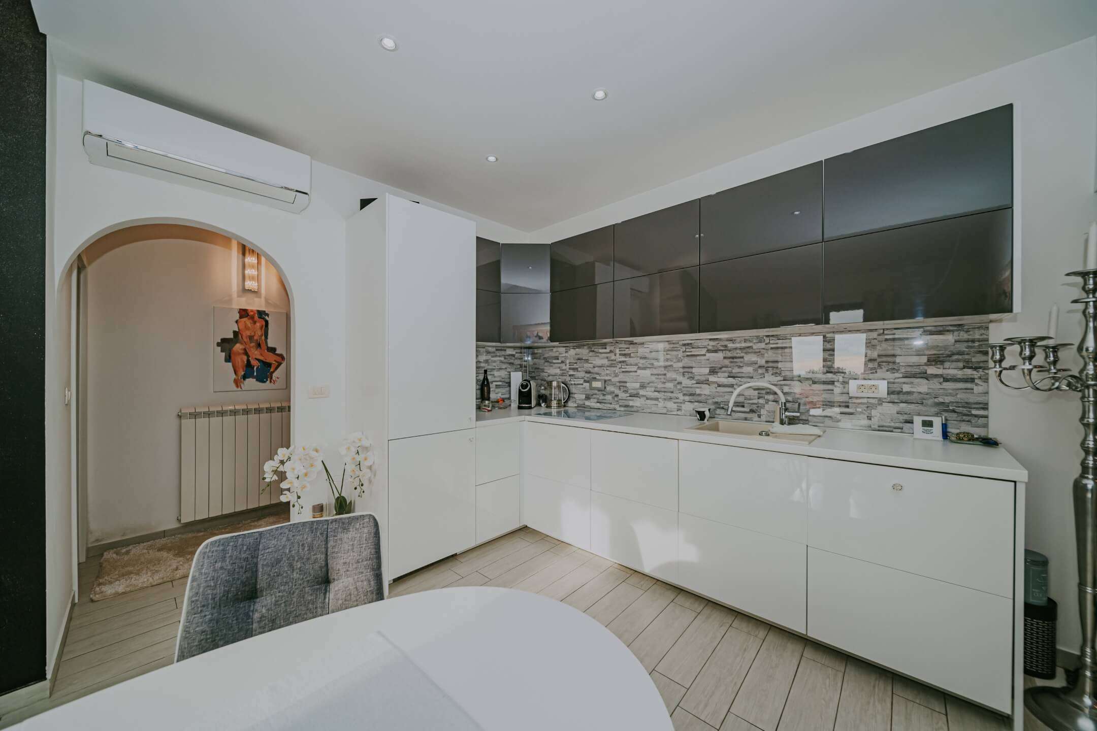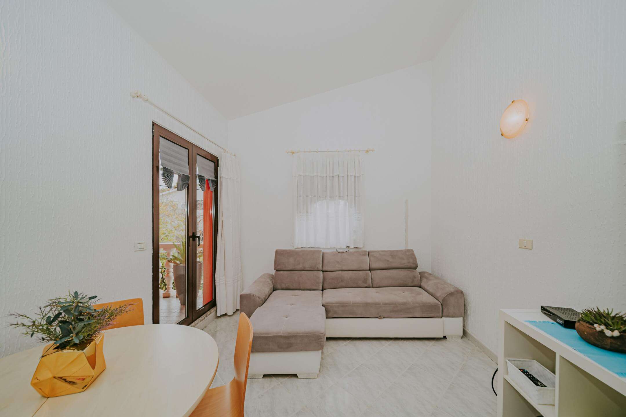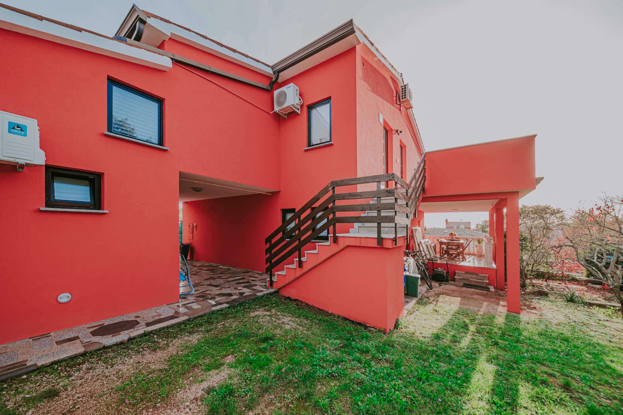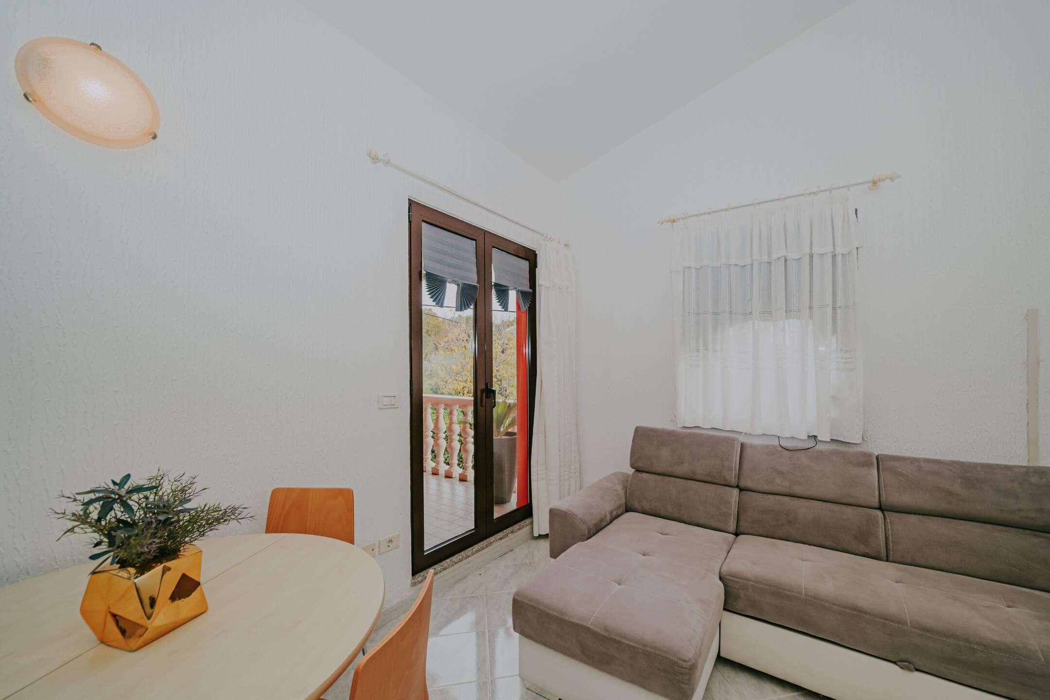 Na prvom katu se nalaze dva odvojena apartmana (40 m² i 42 m²), svaki sa svojim ulazom. Kuća ima 3 balkona i 3 velike terase i potpuno je ukusno namještena. Dvorište kuće je kompletno ograđeno sa dovoljno prostora za parkiranje nekoliko automobila.
