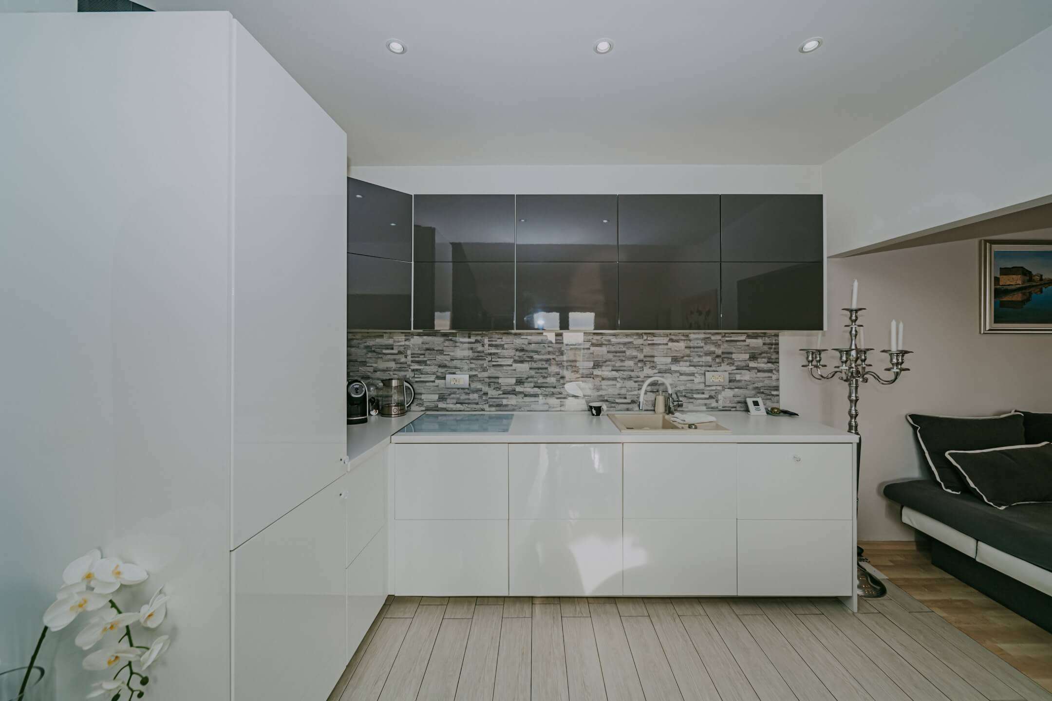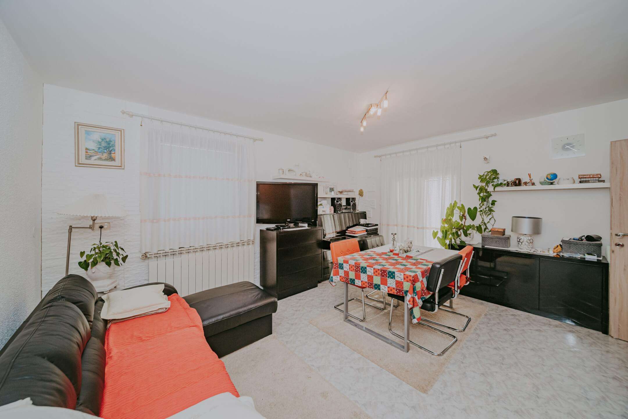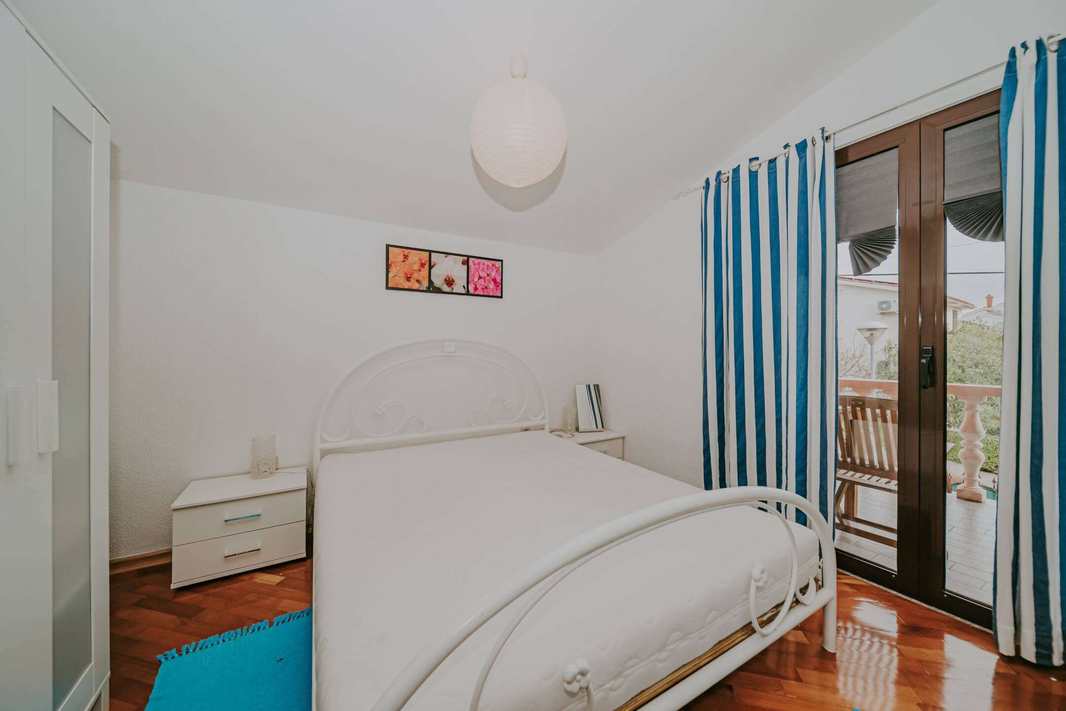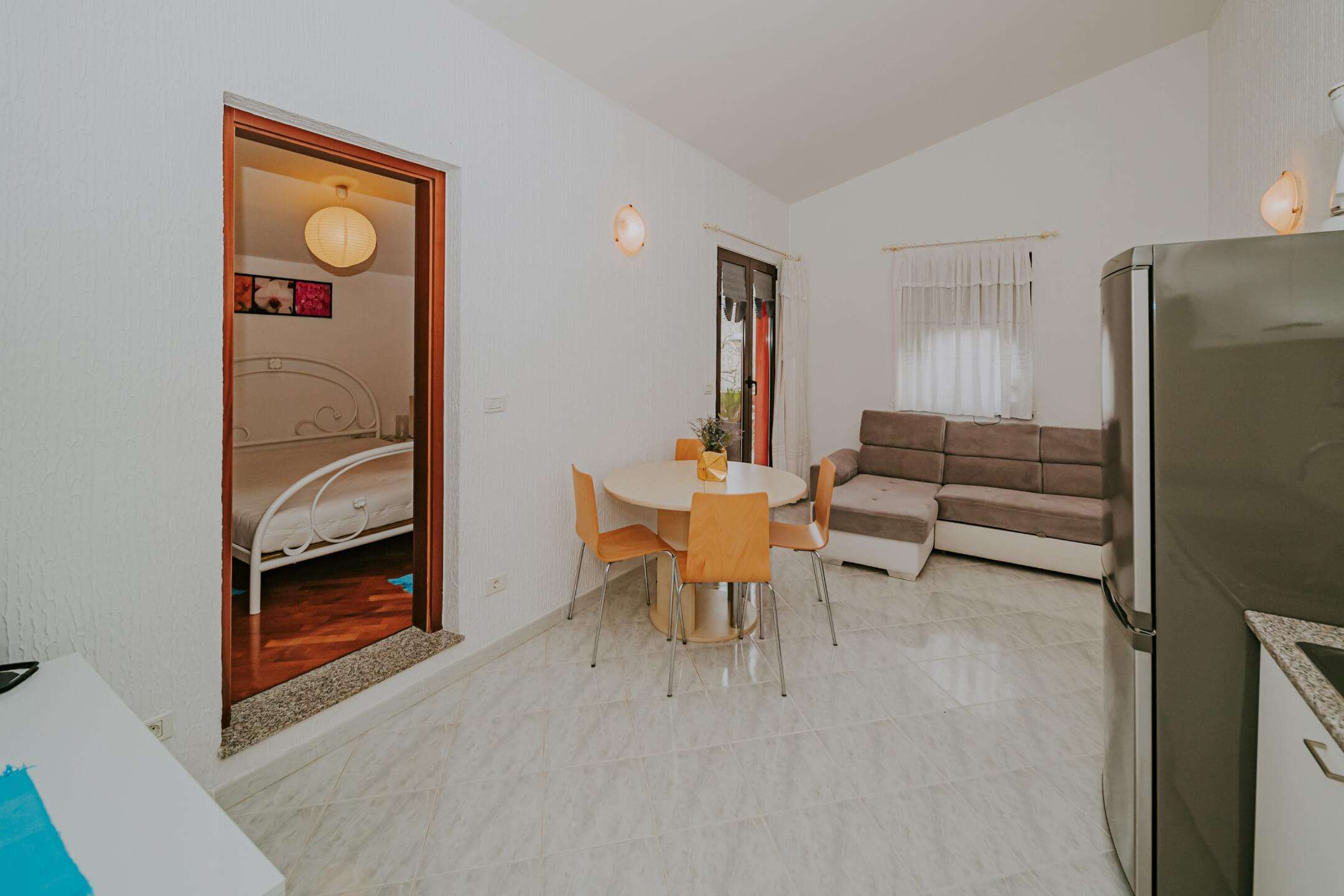 Na prvom katu se nalaze dva odvojena apartmana (40 m² i 42 m²), svaki sa svojim ulazom. Kuća ima 3 balkona i 3 velike terase i potpuno je ukusno namještena. Dvorište kuće je kompletno ograđeno sa dovoljno prostora za parkiranje nekoliko automobila.