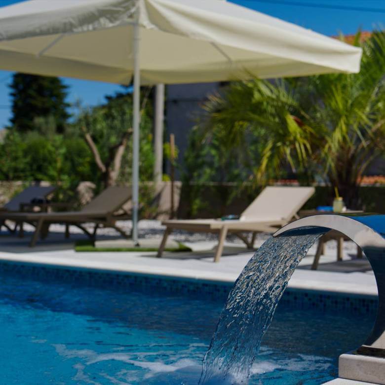 Una splendida nuova villa moderna in vendita vicino a Pola con piscina, vasca idromassaggio e sauna. È un edificio doppio e le ville condividono solo il muro posteriore, mentre ogni villa è un'unità abitativa indipendente con un terreno chiuso separato. La villa ha una superficie totale di 200 m² e si trova su un terreno di 535 m². Al piano terra c'è un bellissimo soggiorno con accesso all'area esterna, una cucina completamente attrezzata con sala da pranzo e una confortevole camera da letto con letto matrimoniale, TV e bagno. Al primo piano ci sono altre 3 comode camere da letto con letto matrimoniale, TV, 3 bagni privati e accesso alla terrazza. Un'oasi benessere con vasca idromassaggio e sauna si trova anche al primo piano. La villa è completamente climatizzata e adatta per 8 persone. Nell'area esterna c'è una rinfrescante piscina privata di 32 m² con cascata, bellissimi mobili da giardino, una terrazza coperta per mangiare, sedie a sdraio e ombrelloni e una cucina estiva attrezzata. Ci sono 2 posti auto privati nel cortile completamente recintato.