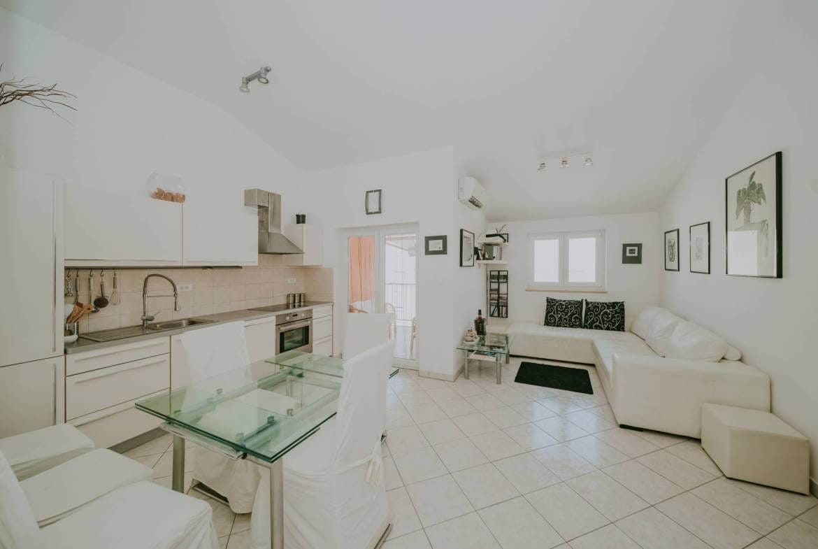 A nice furnished apartment for sale in Karigador, only 150 meters from the sea and the beach! The total area of the property is 60.57 m². The apartment has an area of 55.61 m² and is located on the second floor of a smaller residential building. It consists of a living room with a dining room, a kitchen, 2 bedrooms, a bathroom, a hallway and a beautiful terrace with a view of the sea. The apartment is very well lit. Heating and cooling is on air conditioners. The apartment also has a storage room of 4.96 m² in the basement of the building and one parking space that is owned. The apartment is for sale fully furnished and ready to move in!