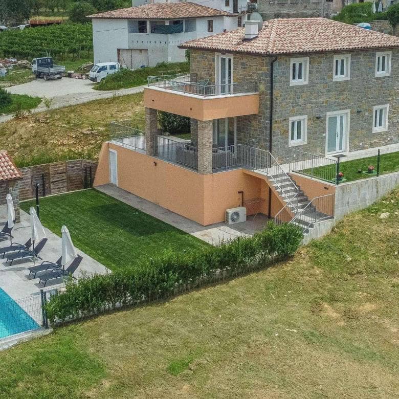 Вилла имеет площадь 205 м² с 3 спальнями, каждая комната имеет собственную ванную комнату. На всей вилле полы с подогревом с использованием теплового насоса и фенкойлов для обогрева и охлаждения. Вилла продается полностью оборудованной и меблированной. В саду площадью 554 м² есть парковочные места, большой бассейн площадью 37 м² с солярием с прекрасным открытым видом и большая летняя кухня с крытой террасой. Качественно построенная вилла в красивом и тихом месте в самом сердце Истрии, в окружении природы, идеально подходит для инвестиций в туризм или для спокойной семейной жизни.