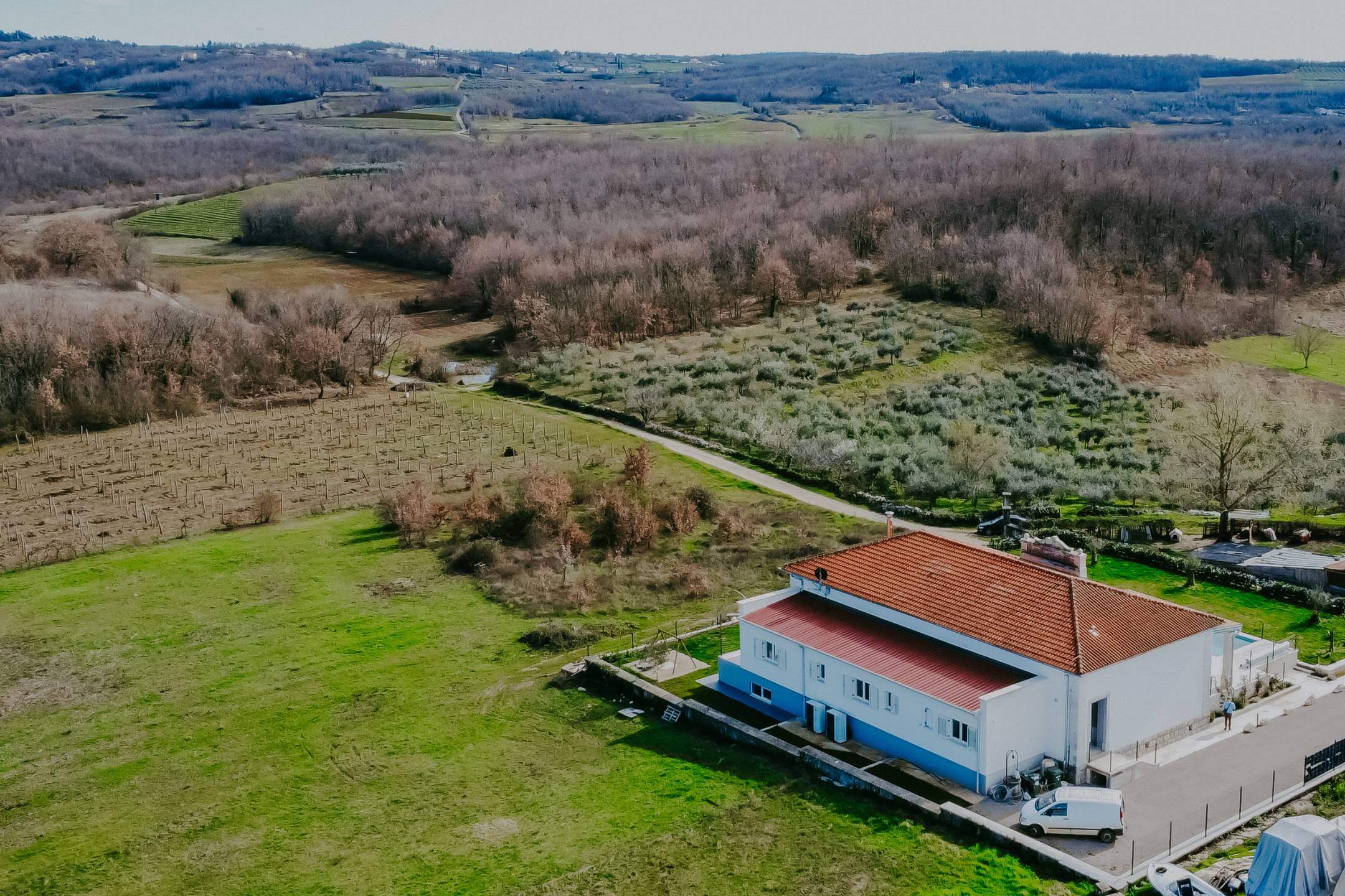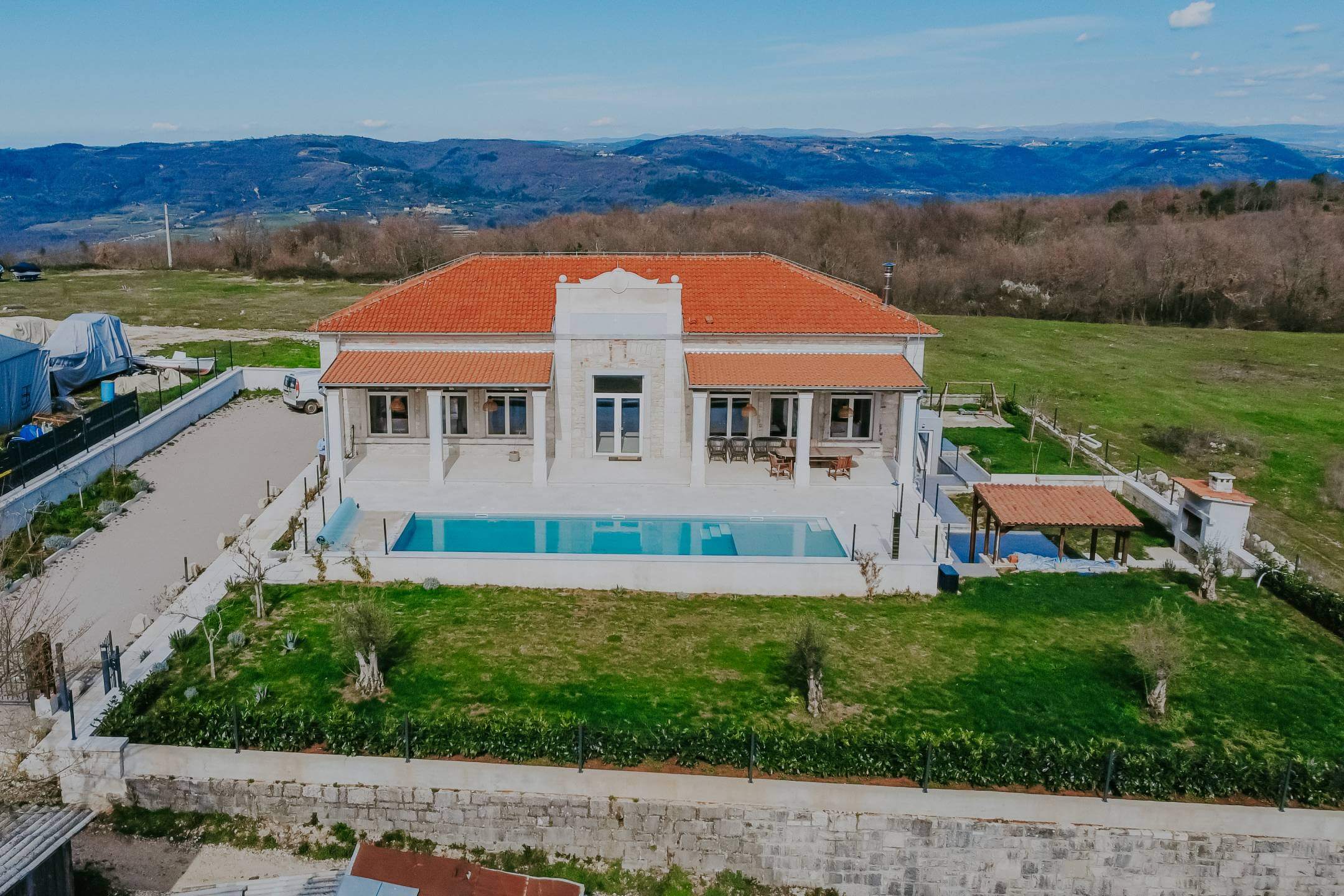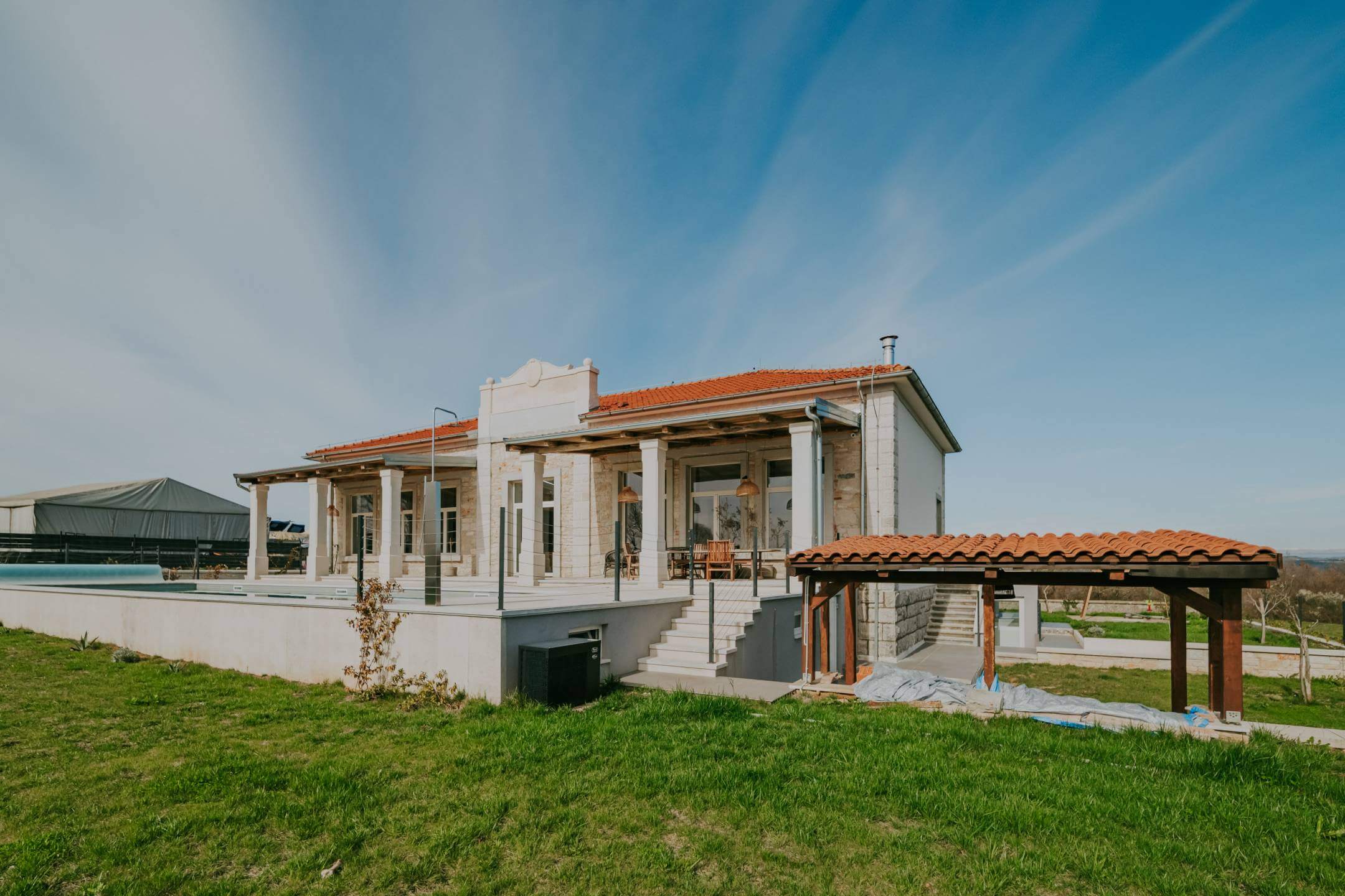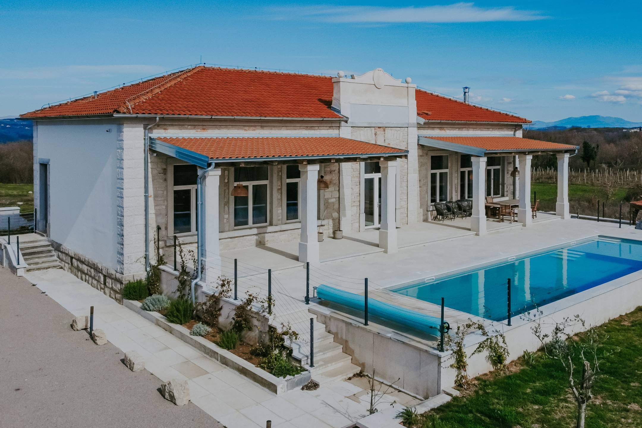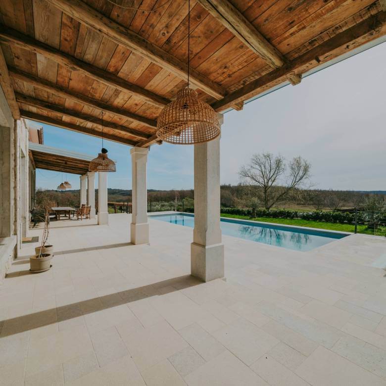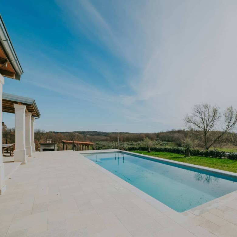 В окрестностях Пореча, в 14 км от моря, находится недавно отреставрированная отдельная вилла с общей жилой площадью 428 м², расположенная на участке площадью 1640 м². Участок имеет правильную форму и позволяет максимально использовать пространство для активного отдыха.