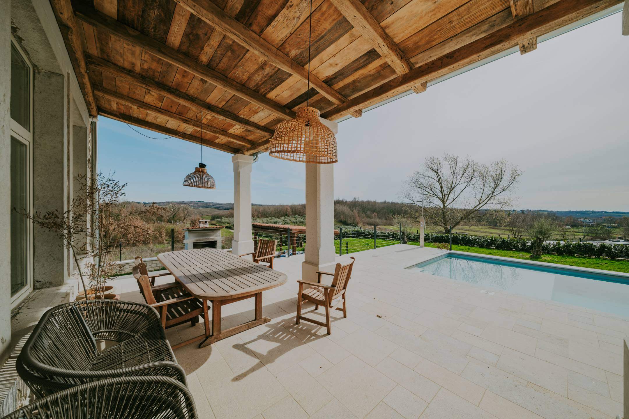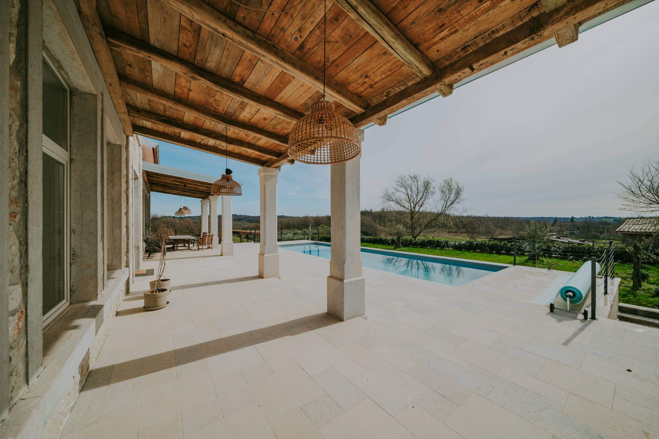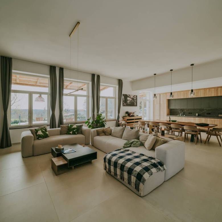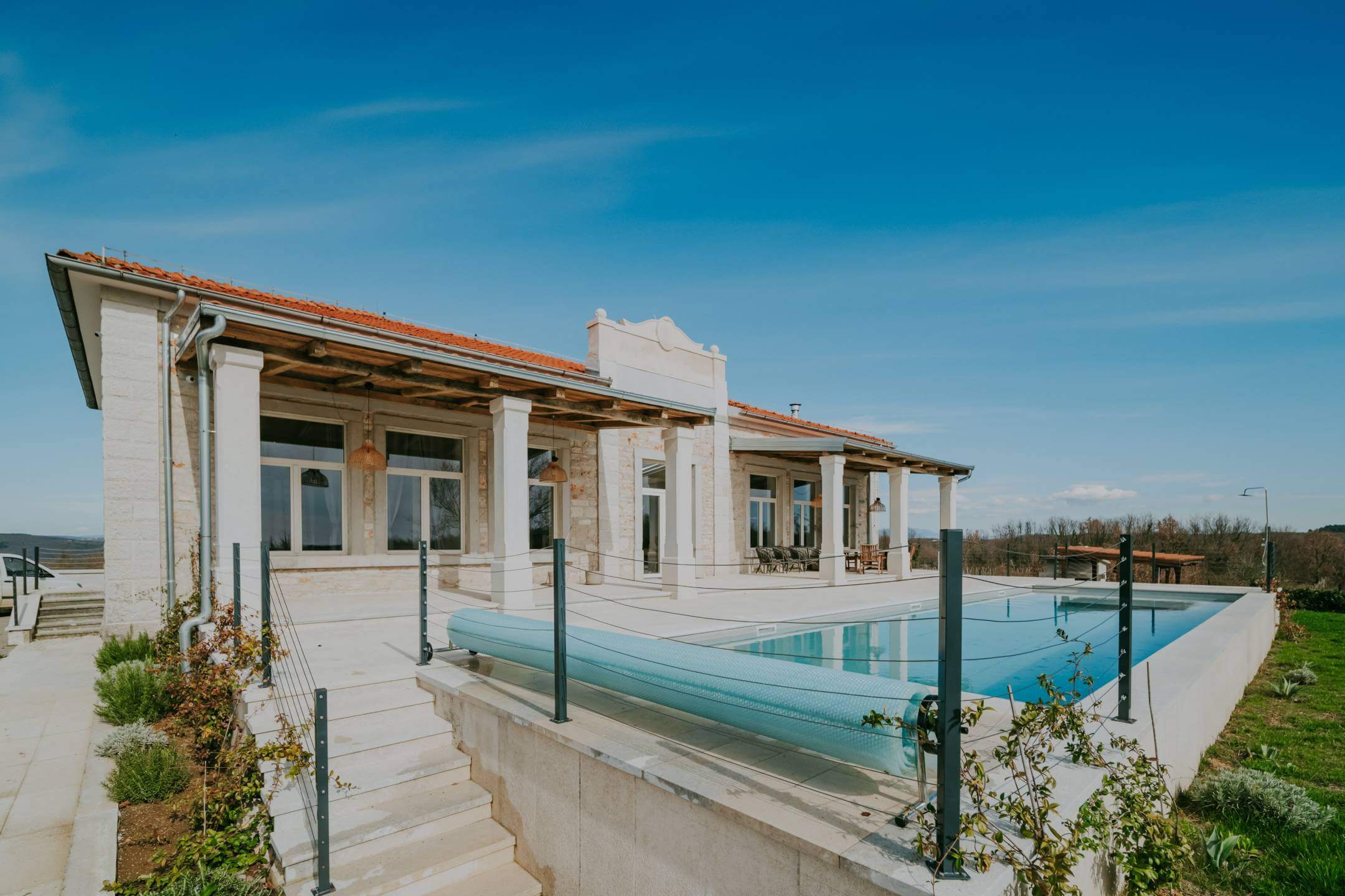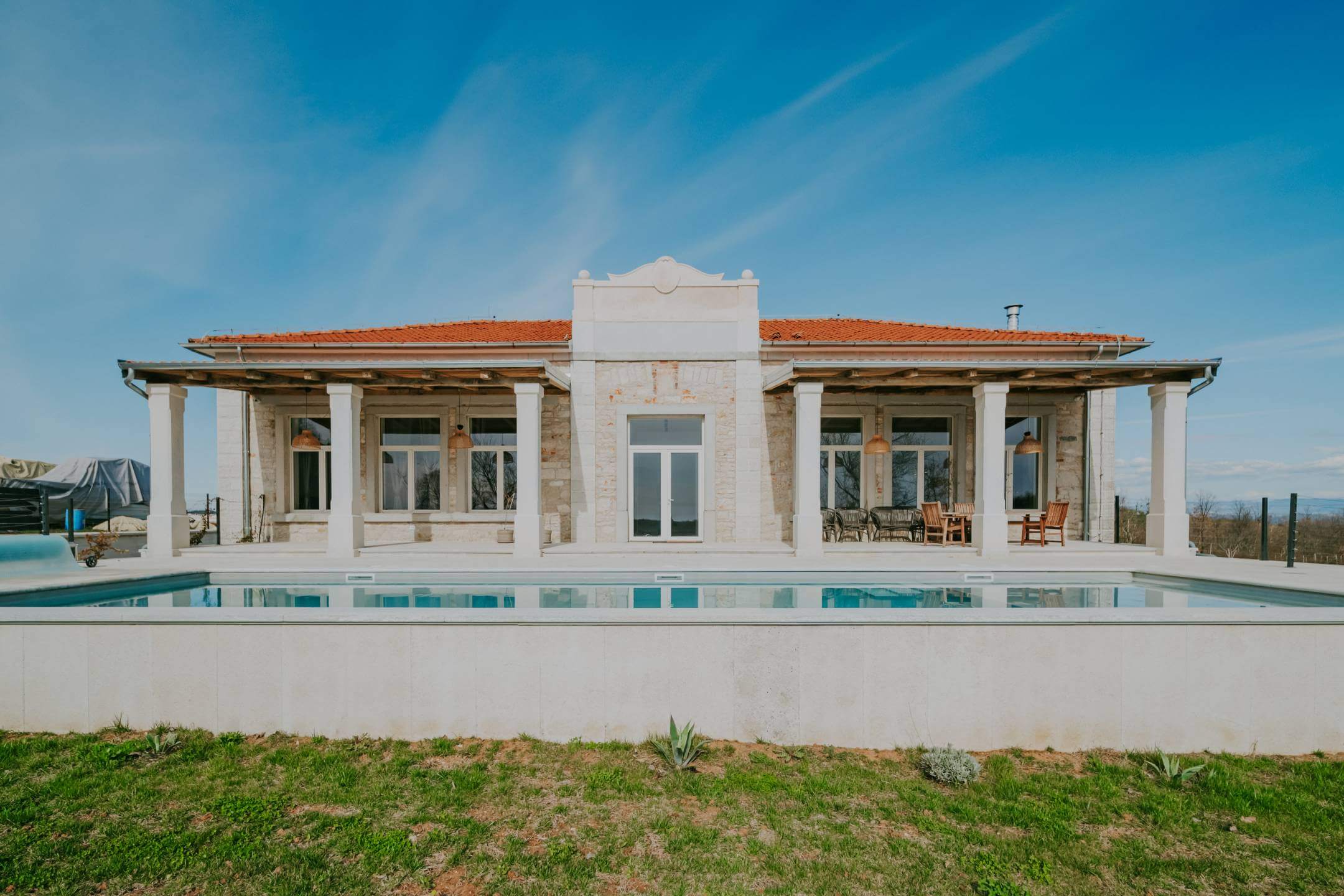 В окрестностях Пореча, в 14 км от моря, находится недавно отреставрированная отдельная вилла с общей жилой площадью 428 м², расположенная на участке площадью 1640 м². Участок имеет правильную форму и позволяет максимально использовать пространство для активного отдыха.