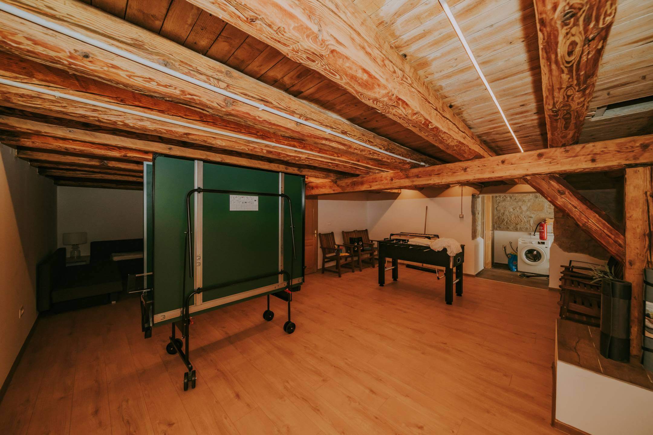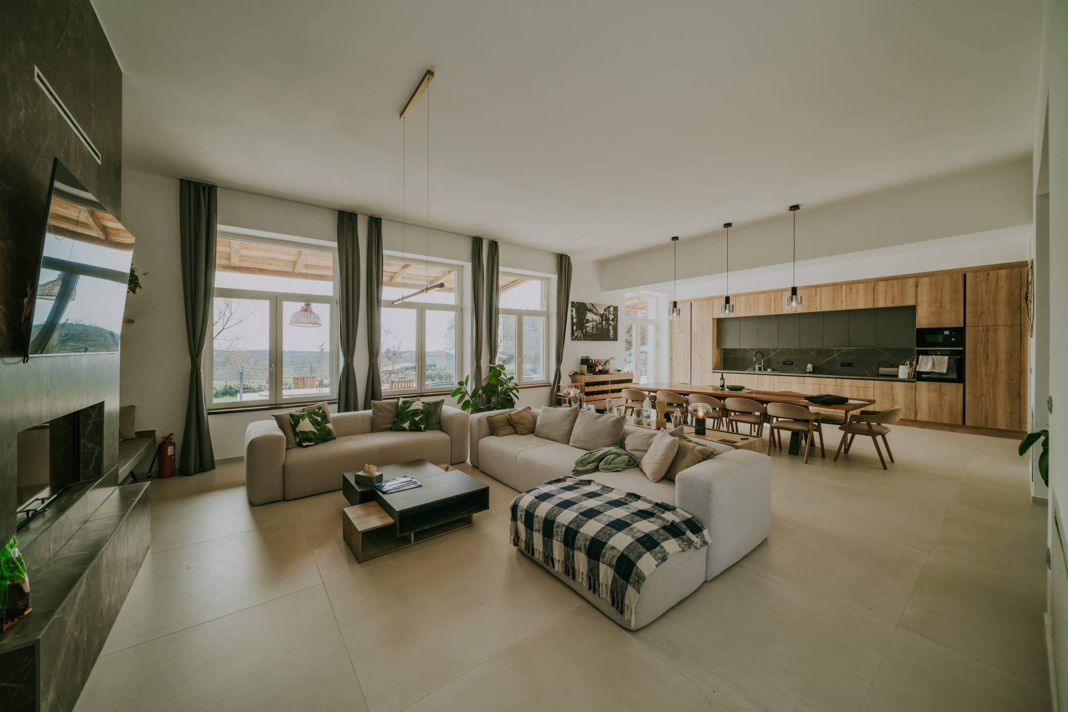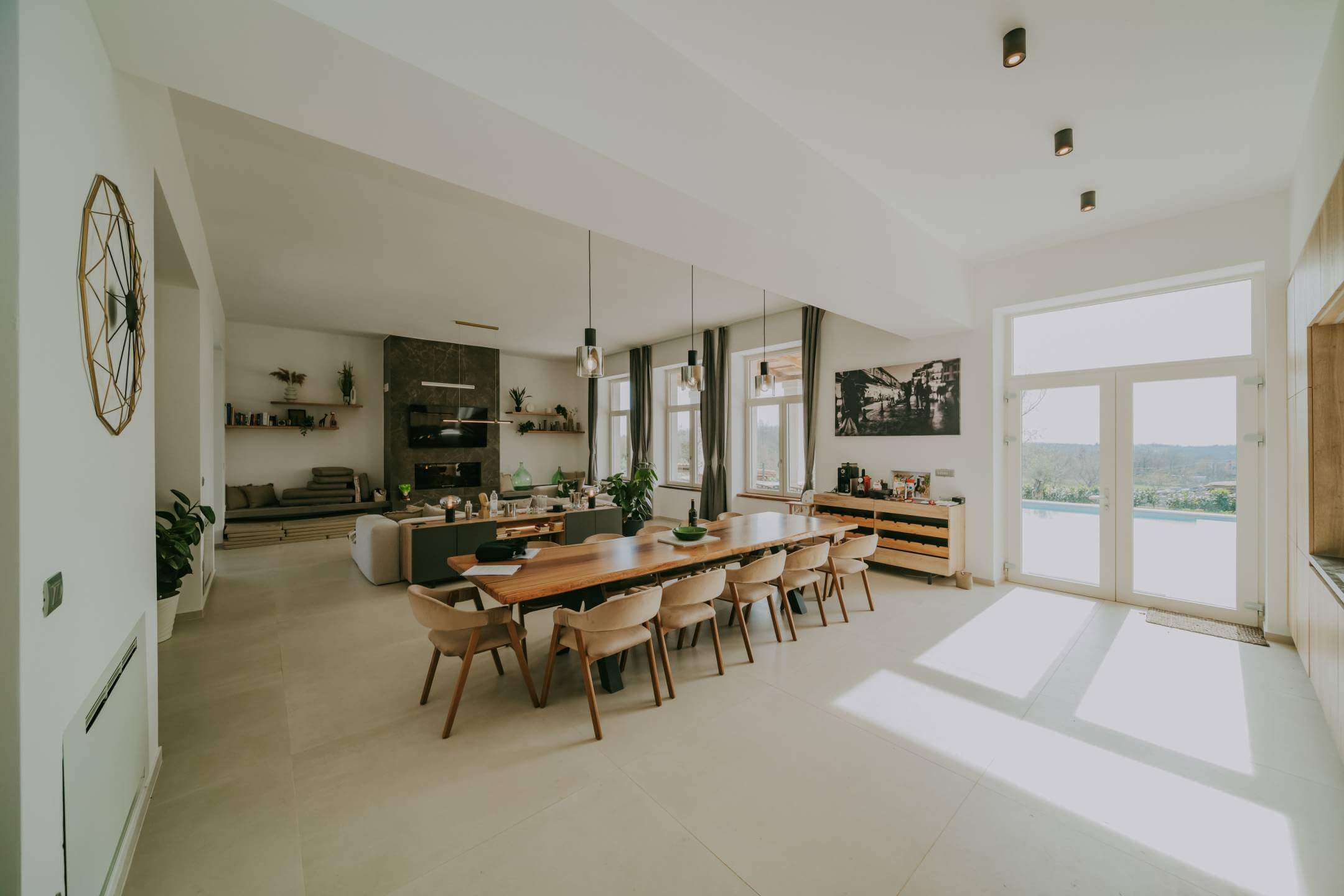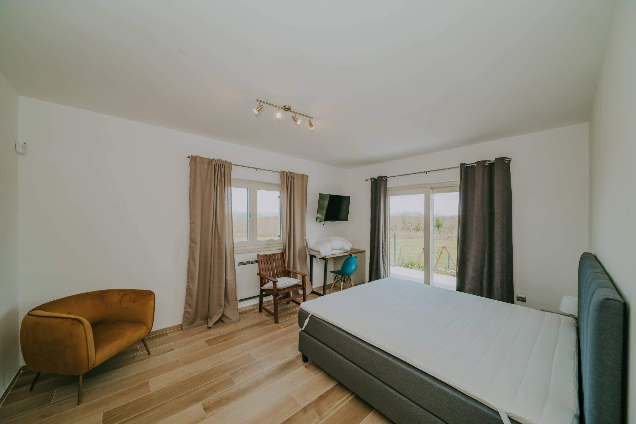 Двор дома полностью огорожен. Здесь есть просторная парковка, детская зона, открытая площадка для общения с барбекю, и все это дополняется чудесной большой террасой, которая доходит до большого бассейна с подогревом. Со всех сторон участка открывается вид на окружающую природу.