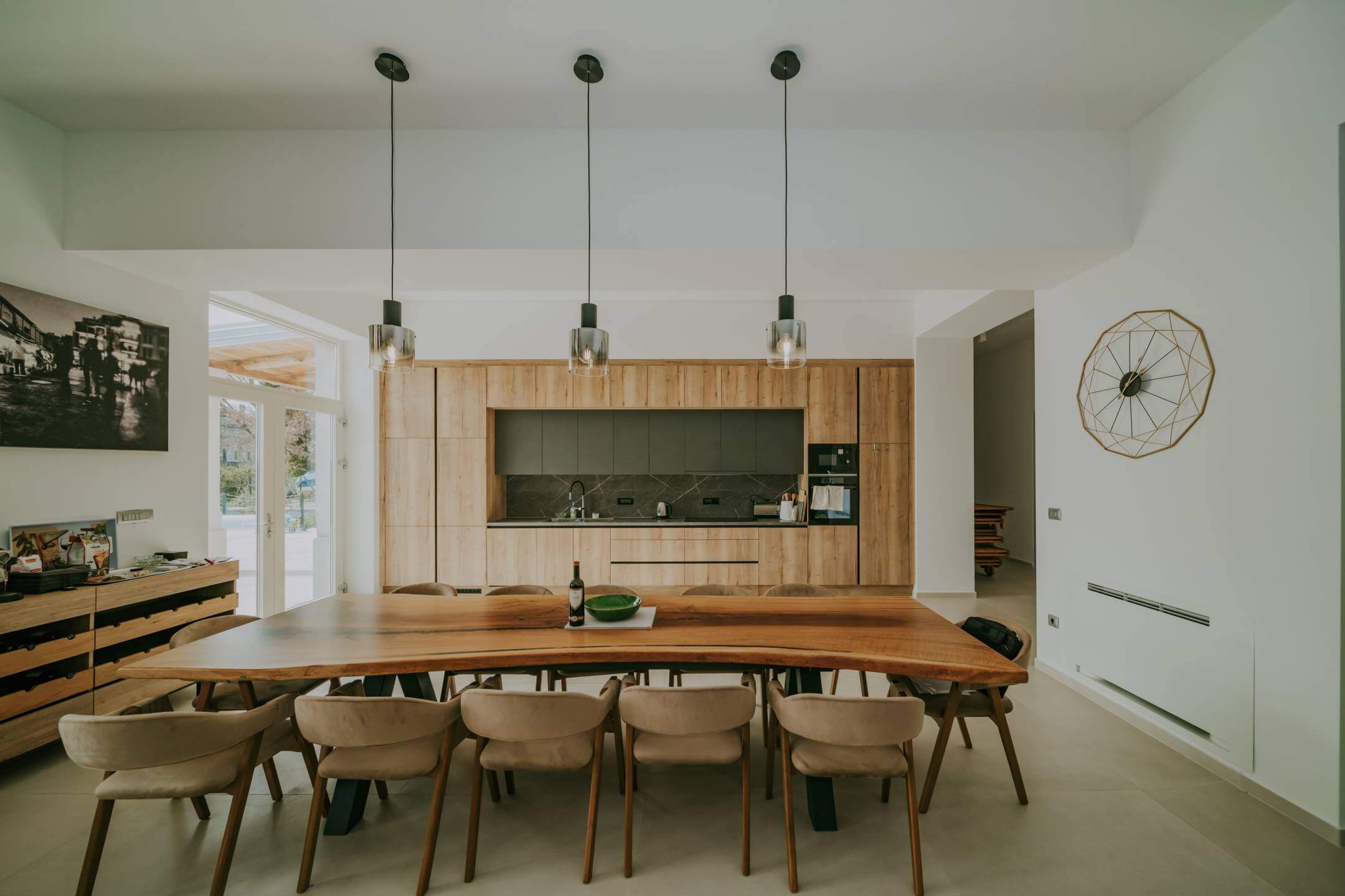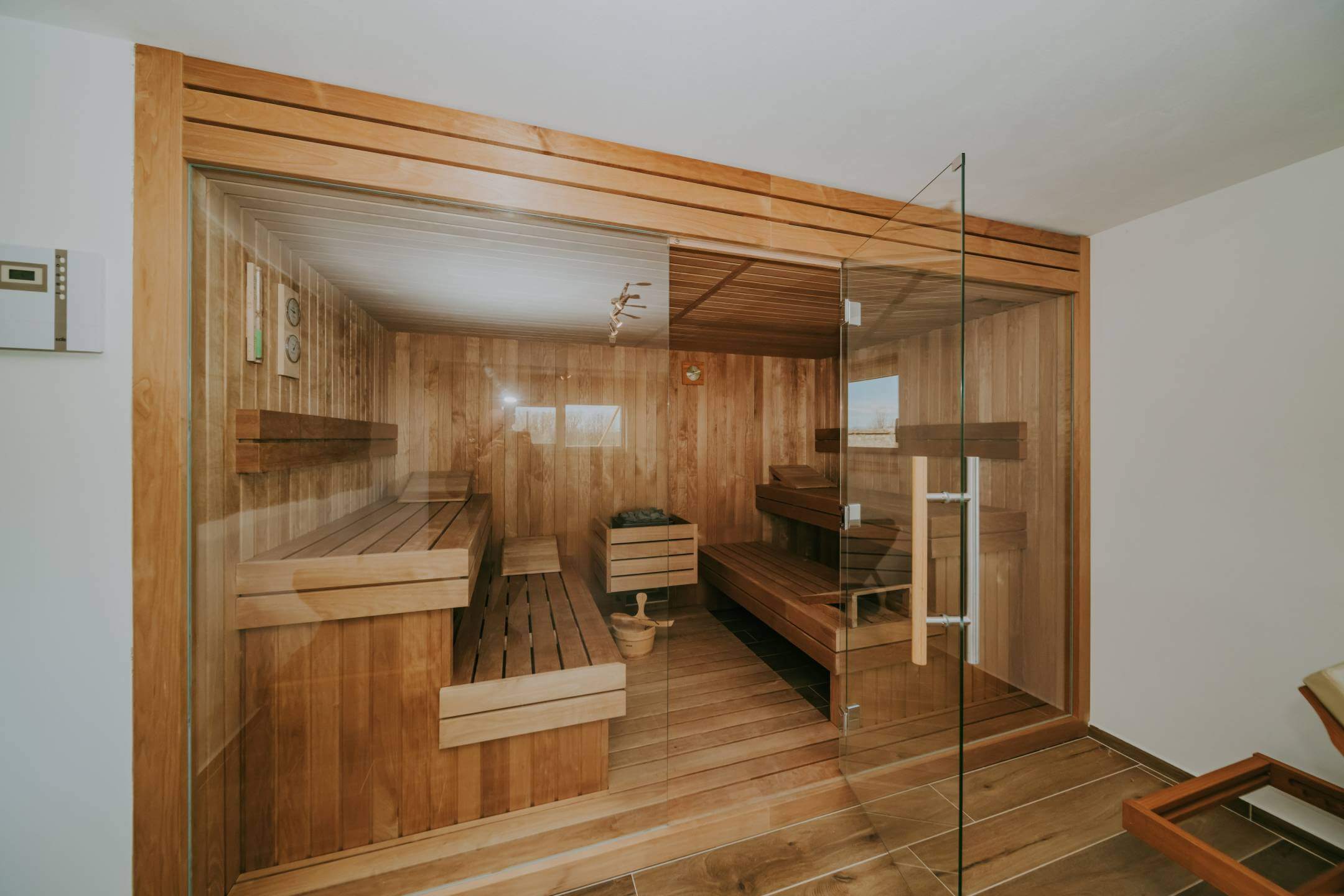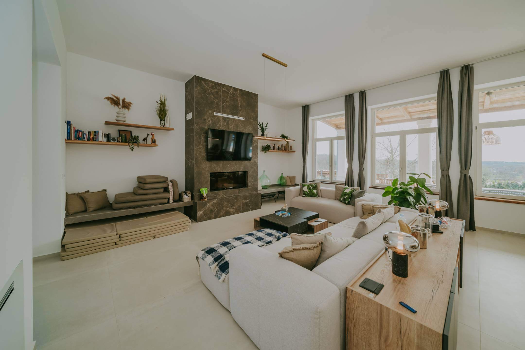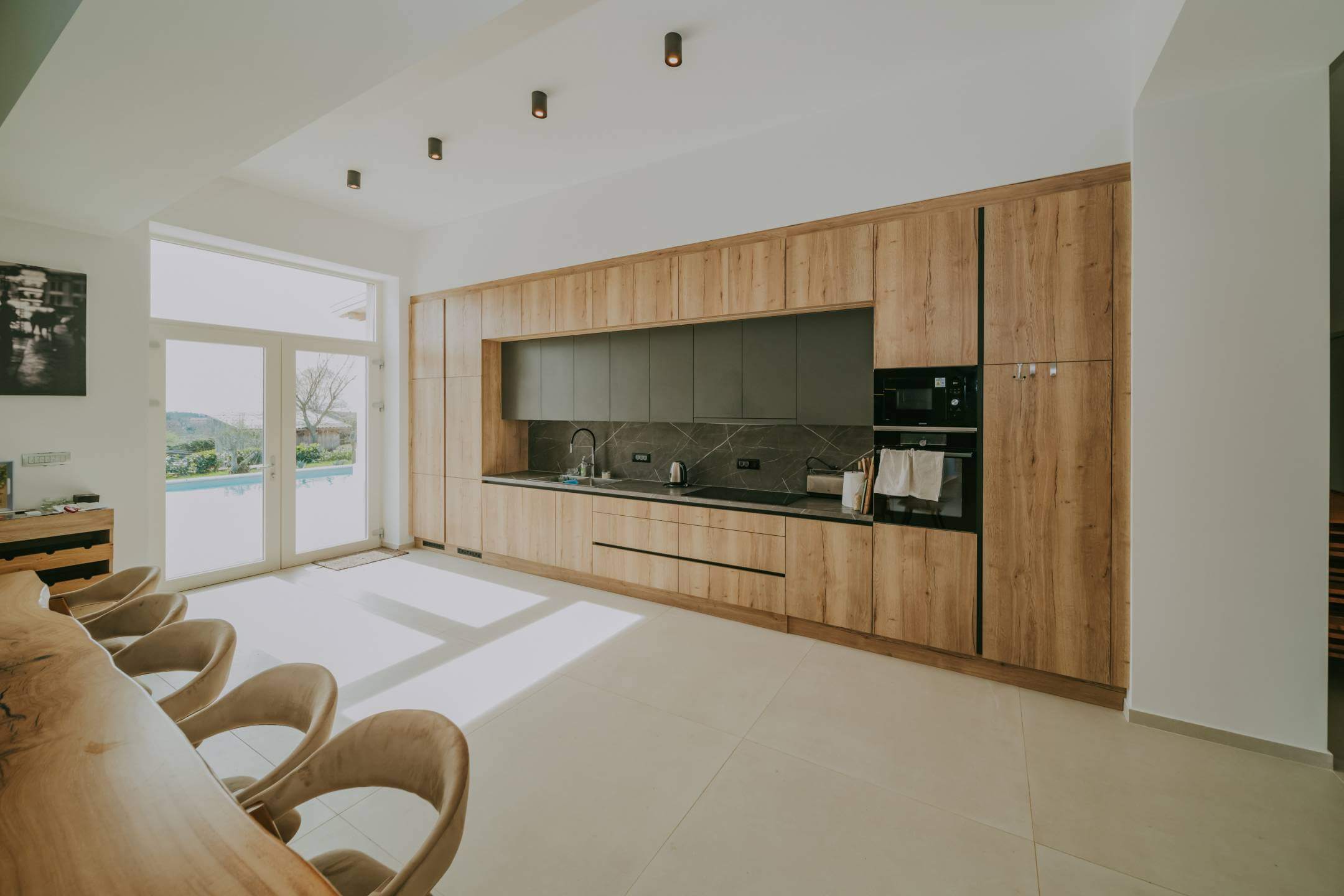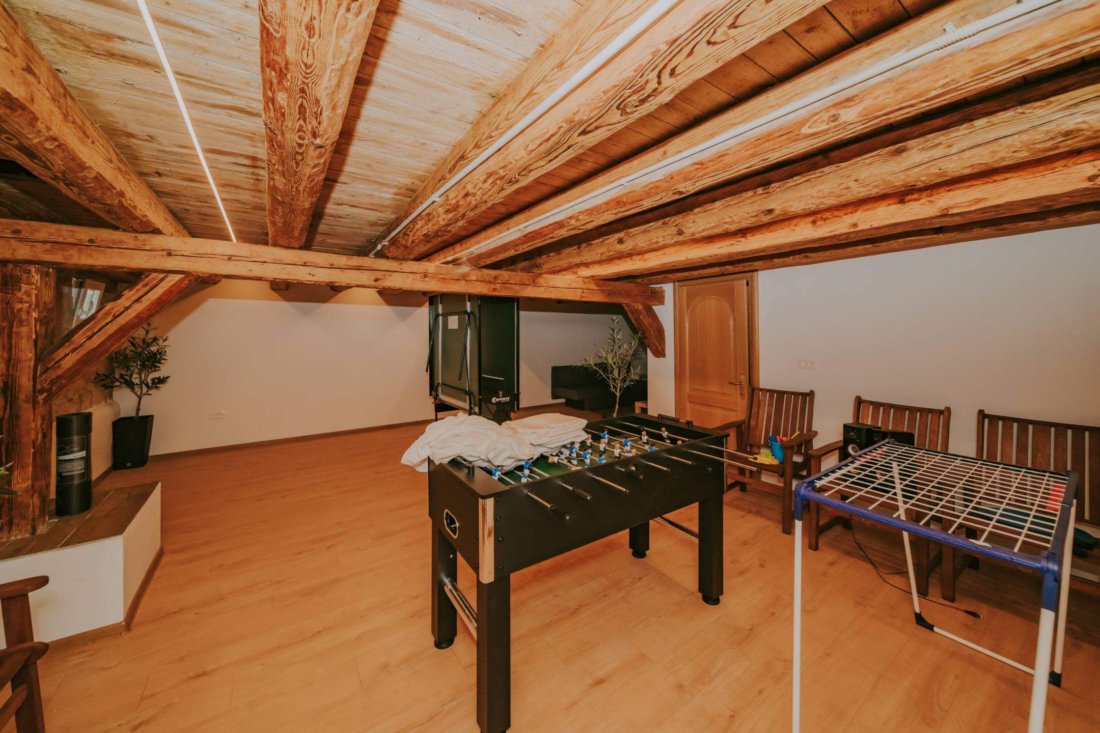 Двор дома полностью огорожен. Здесь есть просторная парковка, детская зона, открытая площадка для общения с барбекю, и все это дополняется чудесной большой террасой, которая доходит до большого бассейна с подогревом. Со всех сторон участка открывается вид на окружающую природу.