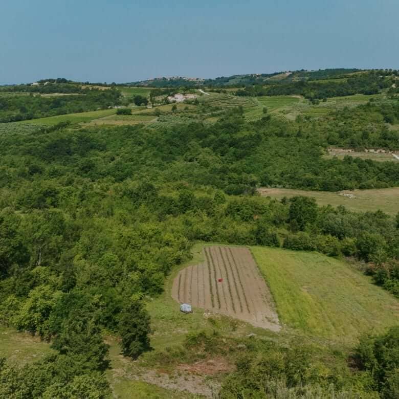 Kmetijski del zemljišča obsega 4782 m². Dostop do nepremičnine je po javni cesti. Vsa potrebna infrastruktura se nahaja le 100 metrov od gradbišča. V bližini je veliko znanih restavracij, kmečkih turizmov, kleti, kolesarskih stez, sprehajališč in raznih drugih vsebin. Buje in Grožnjan so v neposredni bližini, prve plaže pa le 15 minut vožnje z avtomobilom. Zaradi svoje osamljene lokacije je ta nepremičnina prava naložbena priložnost.