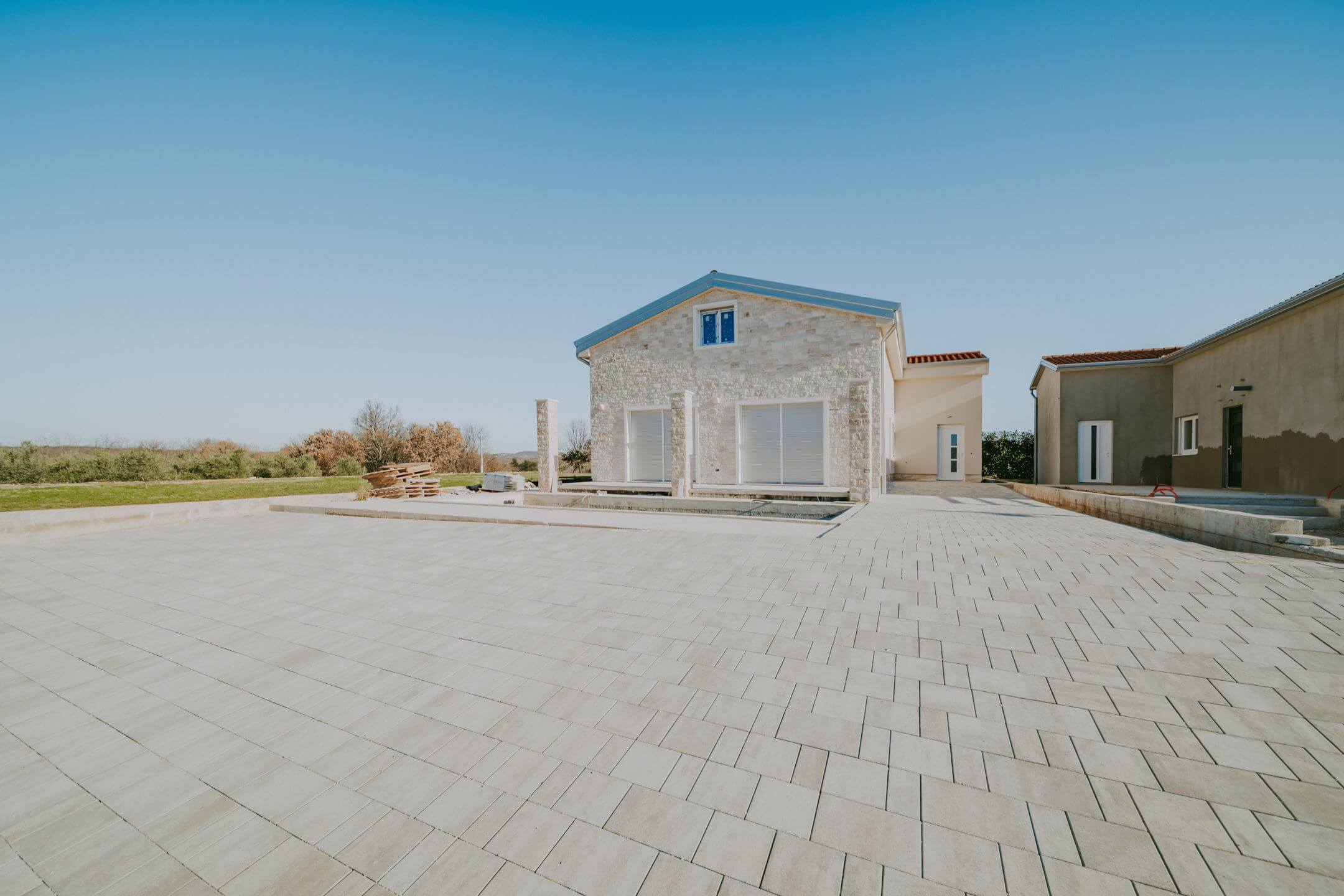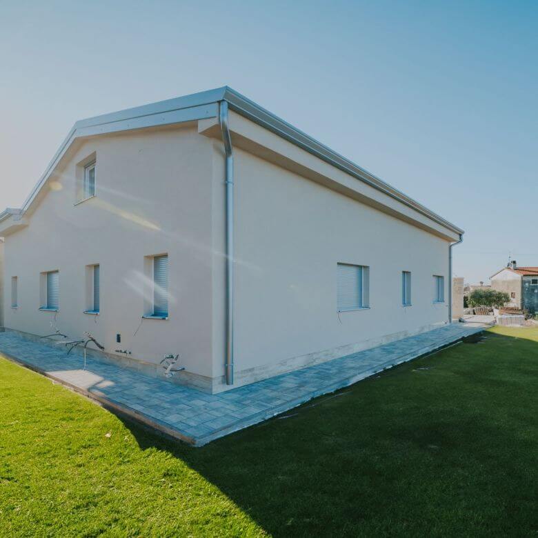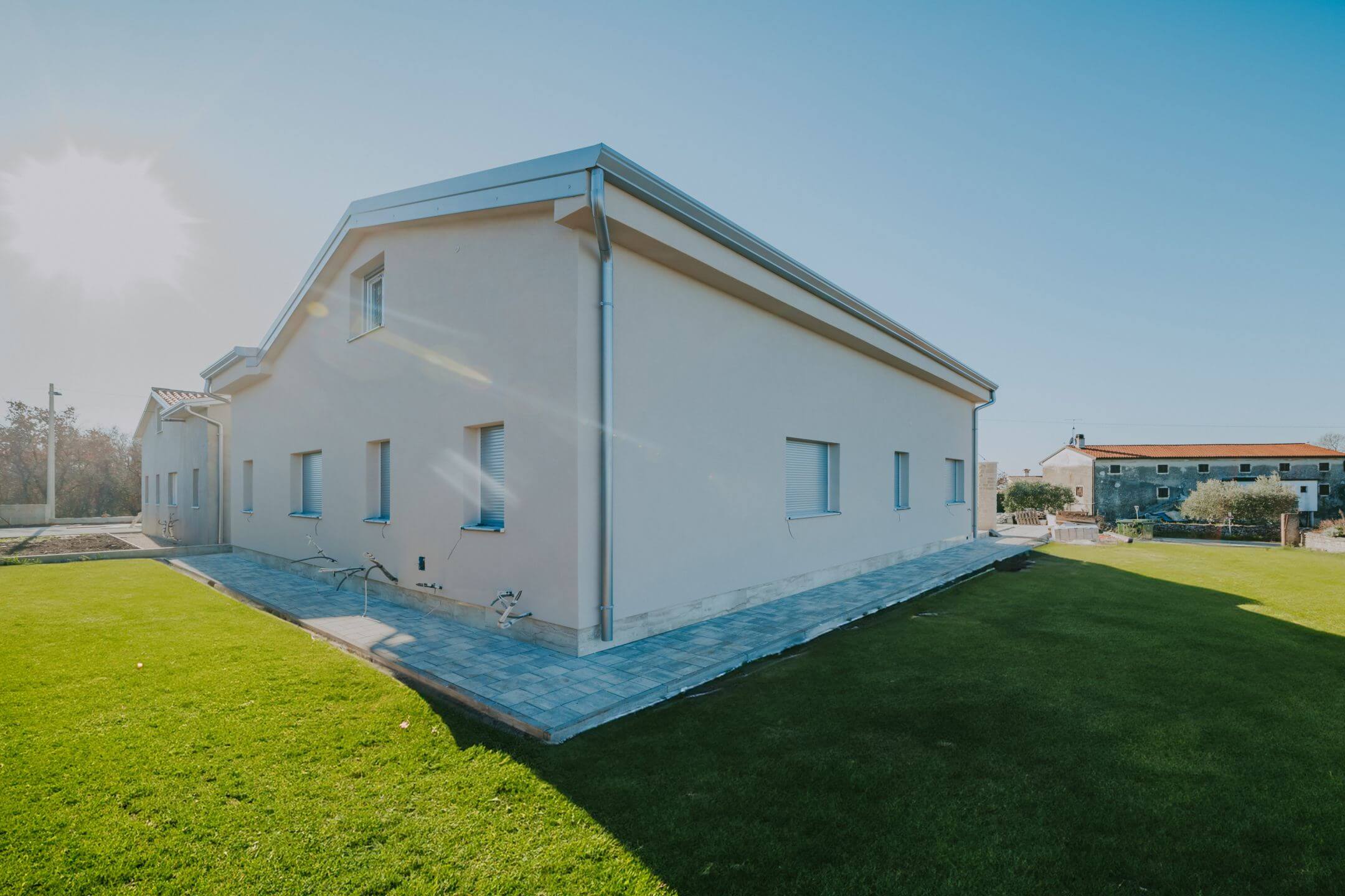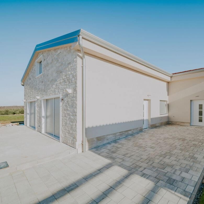 V majhnem mestu, le nekaj minut od mesta Umag in nekaj minut od meje s Slovenijo, se nahaja ta kvalitetna hiša v novogradnji. Skupna površina hiše je 208 m² na parceli 544 m². Hiša se razprostira v dveh etažah, v pritličju se nahaja prostorna dnevna soba, ki je povezana s kuhinjo in jedilnico po konceptu odprtega prostora, ena kopalnica z WC-jem, en WC za goste, dve spalnici in garsonjera z lastno spalnico, stranišče in ločen vhod. Dnevna soba in jedilnica vodita neposredno na teraso, ki bo pokrita in ima pogled na bazen. V prvem nadstropju je možno oblikovati tudi prostorno dnevno sobo, ki bo povezana z majhno kuhinjo in jedilnico, eno spalnico in eno kopalnico, po konceptu odprtega prostora.